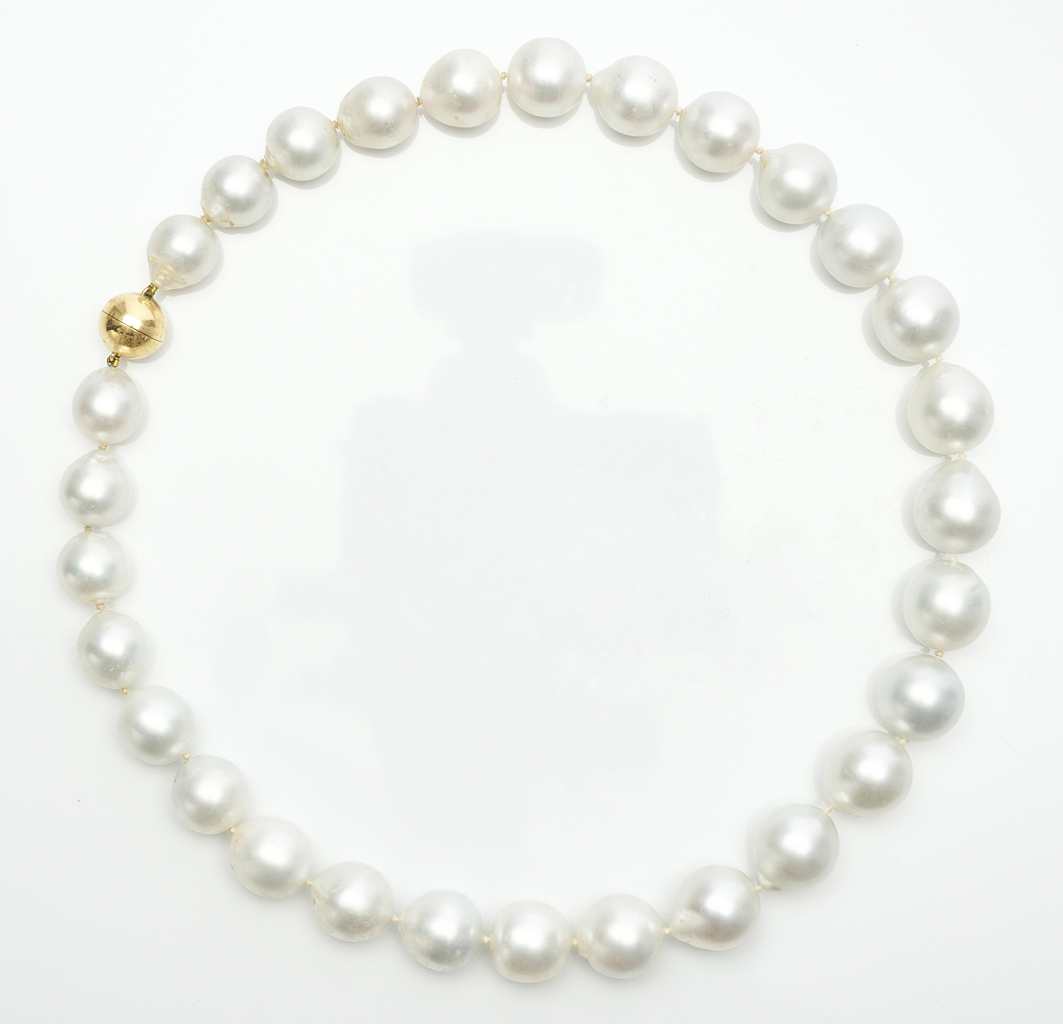 A STRAND OF SOUTH SEA PEARLS COMPRISING twenty nine semi baroque pearls of silver white hues measuring .12.1mm to 14.8mm, to a magnetic gold ball clasp, total length 460mm.