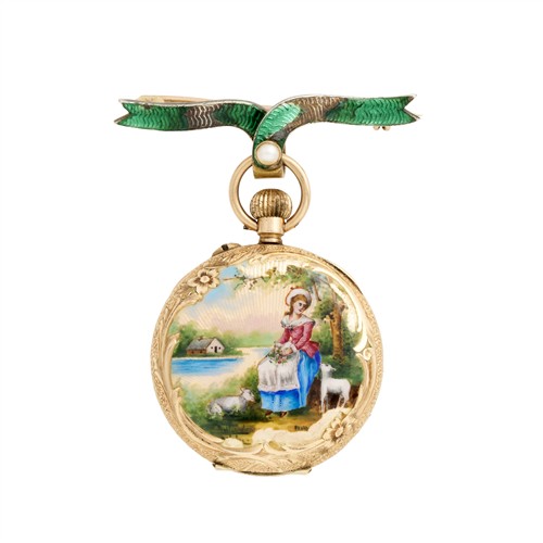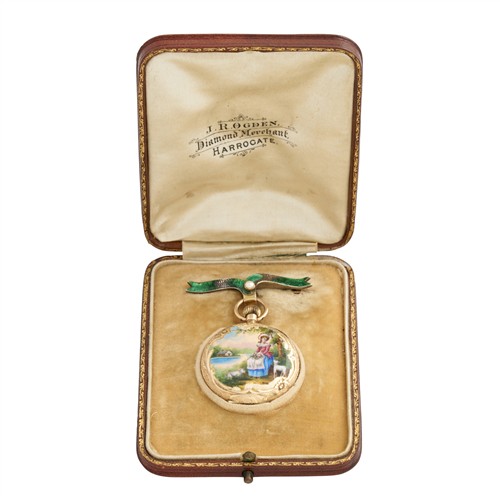 Case: foliate chased and engraved hinged, the reverse decorated with an enamel rural scene of a young lady watching over her lambs, gold cuvette