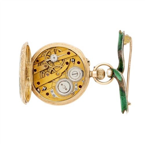 Dial: white enamel, Roman numerals, outer minute divisions gold spade hands,