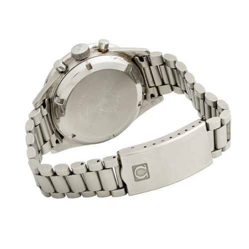 Dial: black, applied Omega logo, luminous baton hour markers, white outer 1/5th second divisions, sunken subsidiary dials at 3, 6 and 9 for seconds, 30 minute and 12 hour recording, luminous filled dagger hands, centre chronograph hand