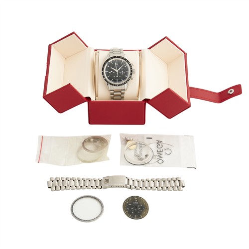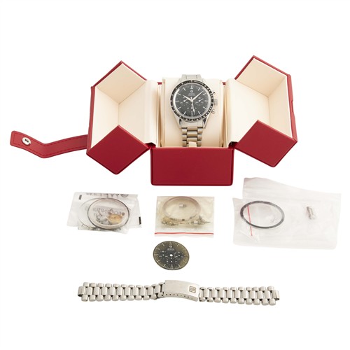 Accessories: Omega service papers dated 16.12.2024 box and pouch, together with replaced watch parts including original dial, dot over 90 bezel and additional Omega stainless steel link bracelet