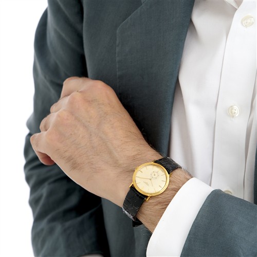 Dial: champagne, applied baton markers, subsidiary seconds at 6, pointed baton hands